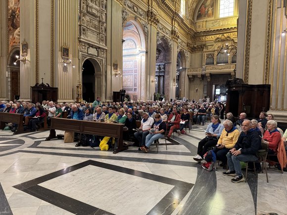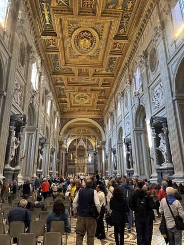 Gemeinsam unterwegs sein für die nächsten fünf Tage. Gemeinsam Glauben erleben und sich Gott näher fühlen. 357 Pilgerinnen und Pilger des Bistums Speyer haben sich auf den Weg gemacht. Und das ganz individuell – die einen zu Fuß, die anderen mit dem Bus, wieder andere mit dem Flieger. An diesem sonnigen Sonntagmorgen sind wir nun vor dem Lateran alle zusammengekommen und starten in die Wallfahrt im Heiligen Jahr 2025. Begleiten werden uns dabei immer wieder Hoffnungsklänge, das „Licht des Lebens“, die Hymne des Heiligen Jahres, mit dem wir uns mit allen Christinnen und Christen verbunden fühlen können. Eckpfeiler unserer Wallfahrt ist das Durchschreiten der Heiligen Pforten. Die erste, durch die wir in Stille laufen, ist die Porta Santa der Lateranbasilika. Anschließend findet sich Zeit, die beeindruckend verzierte Basilika zu erkunden.