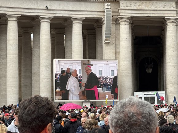 In der gleichen Zeit, nur wenige Meter vom Petersdom entfernt, erlebten Bischof Wiesemann und Weihbischof Georgens die Audienz noch näher, noch unmittelbarer. Und auch Generalvikar Magin und Kerstin Fleischer verfolgten die Ansprache des Papstes aus nächster Nähe. Nach der Audienz bekamen Bischof Wiesemann und Weihbischof Georgens auch die Gelegenheit bei einer Privataudienz Papst Leo die Hand zu geben und mit ihm ein paar Worte zu wechseln. Und dann das: Auch Kerstin Fleischer und Generalvikar Magin konnten sich spontan in die Schlange der Privataudienz anstellen, was sie natürlich direkt getan haben. Kerstin Fleischer berichtete danach: „Das war ein sehr bewegender Moment. Nachdem wir uns vorgestellt haben, haben wir Papst Leo berichtet, was unsere Diözese gerade bewegt und dass wir für ihn beten. Er hörte uns zu und antwortete dann: „God bless you.“ Diese Begegnung werde ich niemals vergessen!“