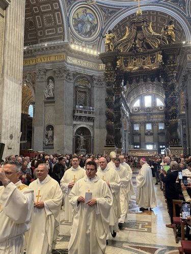 Der Morgen des zweiten Tages startete mit einem beeindruckenden und bewegenden Pilgerweg von der Engelsburg über die Via de la Conciliazione, über den Petersplatz in die Peterskirche. Gemeinsam beteten wir, verbunden über die Kopfhörer, vorne weg abwechselnd Pilgerinnen und Pilger, die ein Holzkreuz trugen und die Gruppe leiteten. Das Tragen des Kreuzes löste tiefe Berührung aus. Der Weg führte vom Obelisken auf dem Petersplatz hinein in den Petersdom durch die Heilige Pforte. Angekommen im Petersdom feierte die Reisegruppe einen Gottesdienst. Ein erhabenes Gefühl machte sich breit, in diesem denkwürdigen Dom, gemeinsam eine Messe zu feiern.