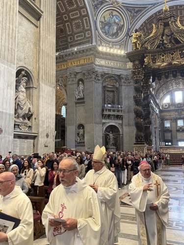 In der Kirche S. Andrea della Valle feierten wir dann zum Abschluss einen feierlichen Gottesdienst. Musikalisch erneut gestaltet von unserem Wallfahrtschor, mit Liedern, die uns die gesamte Reise bereits begleiteten. Bischof Wiesemann resümierte in seiner Predigt: „Wie reich beschenkt wurden wir mit diesen Tagen, tiefgehende Erfahrungen, die uns wieder neue Hoffnungskraft des Glaubens gegeben haben und uns zu Pilgerinnen und Pilger der Hoffnung machen. Wie die Kirche lebt, wie der Glaube lebt, das durften wir in diesen Tagen in Rom, als Ort der Kirche der ganzen Welt, erleben.“